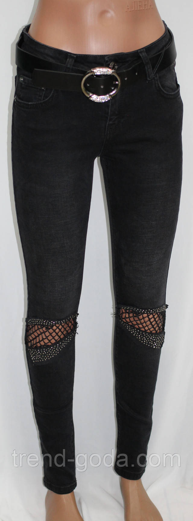 Джинси жіночі штани молодіжні, сіро-чорні, коліна сіточка