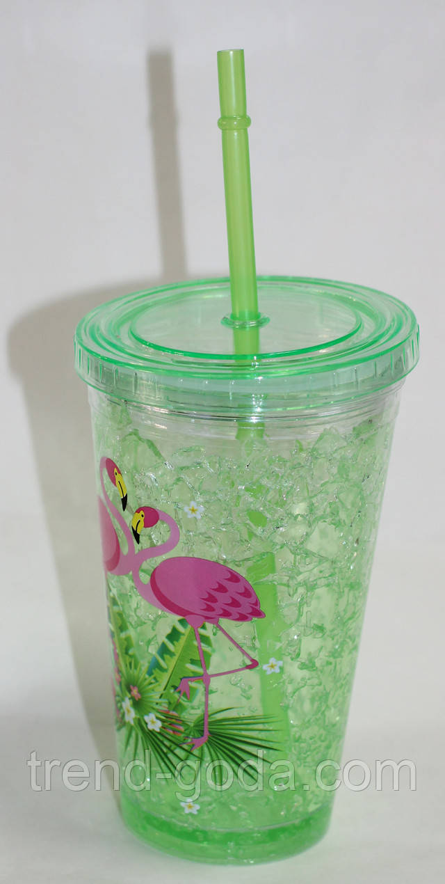 Термо-стакан пластик з кришкою і трубочкою, салатовий, малюнок фламінго